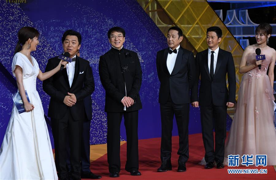 11月23日,黄渤、成龙、陈道明、吴京(左二起)在红毯仪式上。 当日,第28届中国金鸡百花电影节红毯仪式在福建厦门举行。 新华社记者 张国俊 摄