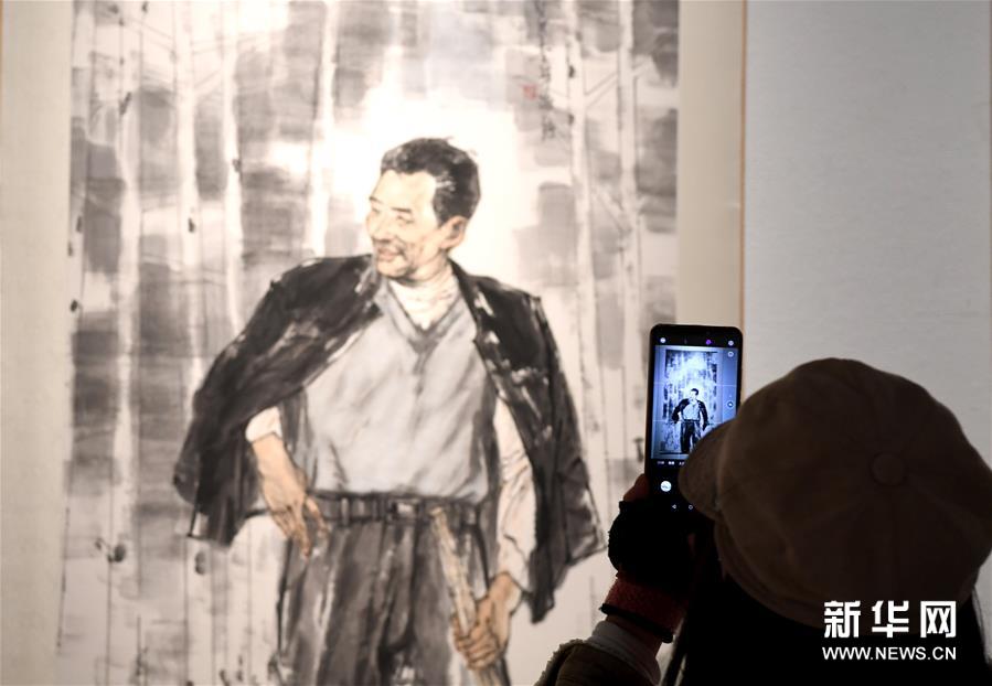 11月27日,观众在河南省美术馆内拍摄展出作品。新华社发(郝源 摄)