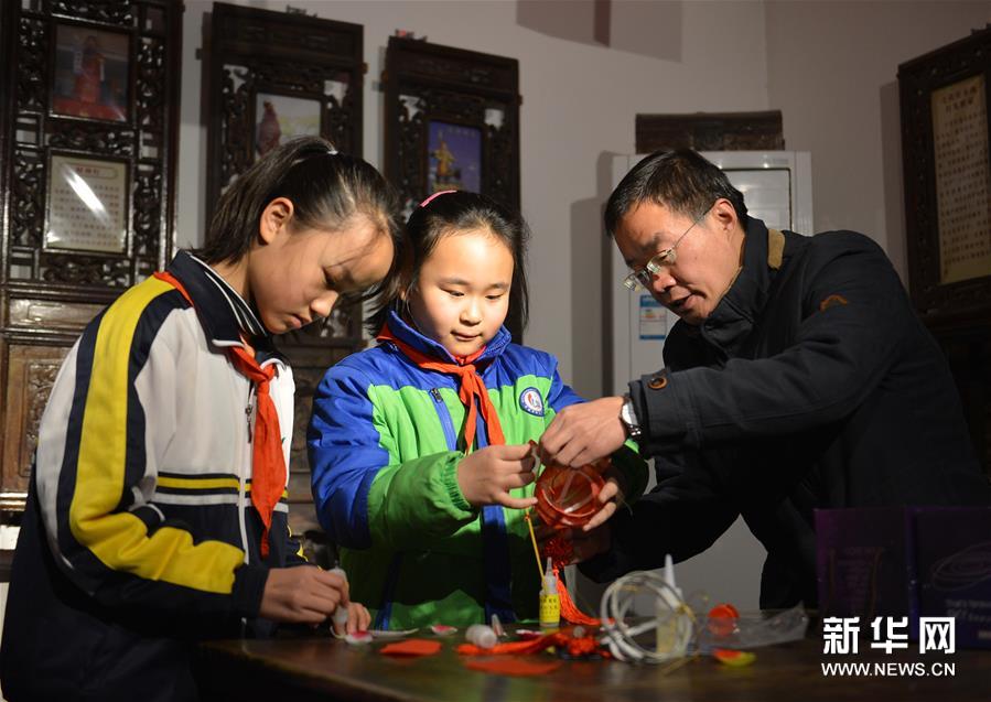 11月27日,在“汴京灯笼张”彩灯展览馆,张俊涛与前来参观的小学生一起制作莲花灯。新华社记者 任鹏飞 摄