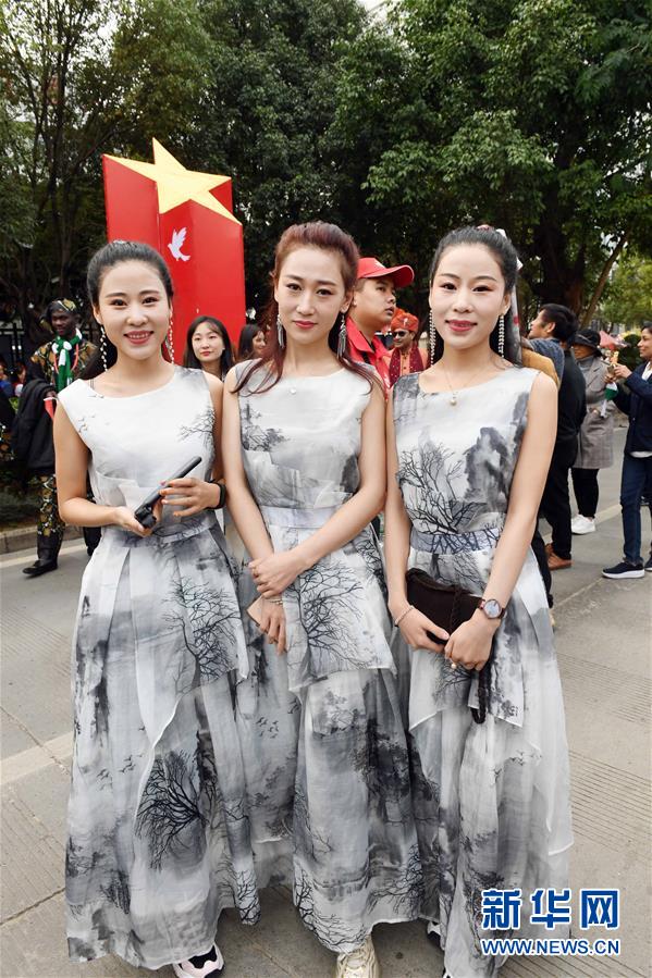 11月28日,来自北京的三胞胎姐妹在花车巡游前合影。新华社记者 杨宗友 摄