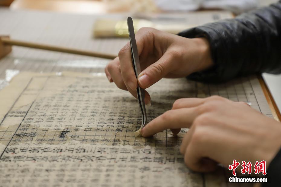 12月3日,记者探访了贵州民族大学图书馆古籍修复中心,了解古籍修复师如何让因自然条件等原因而霉变、虫蛀、破洞的古籍“重获新生”。破损古籍修复需要古籍修复师经过拆书、洗书、晾干、修补等十几道工序。图为古籍修复师正在修复古籍。中新社记者 瞿宏伦 摄