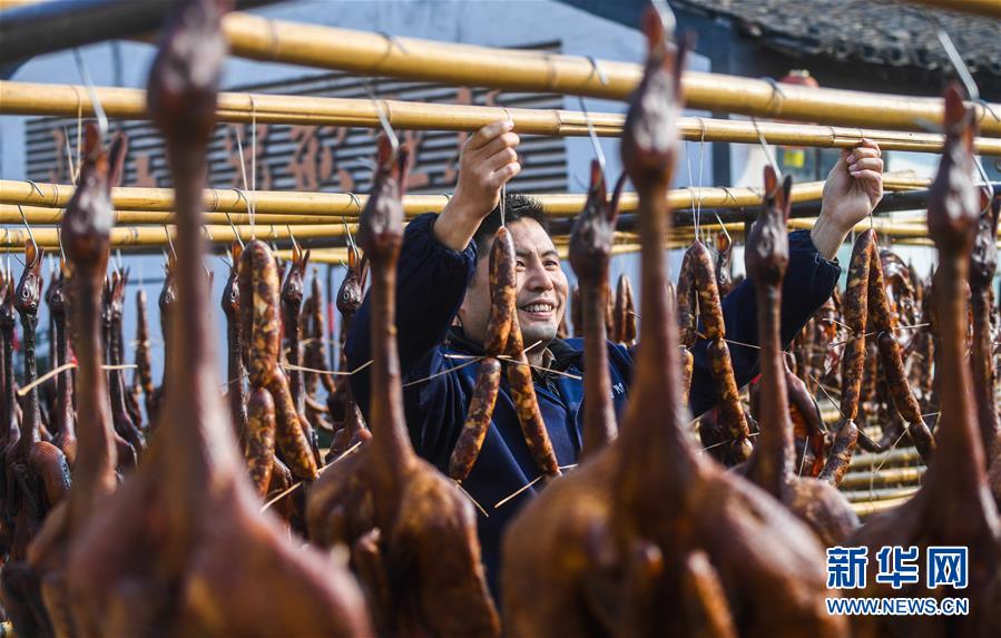 12月3日,安昌古镇一家名为阿红香肠的传统腊味作坊里的工作人员在晾晒各种手工制作的绍兴腊味。新华社记者 徐昱 摄