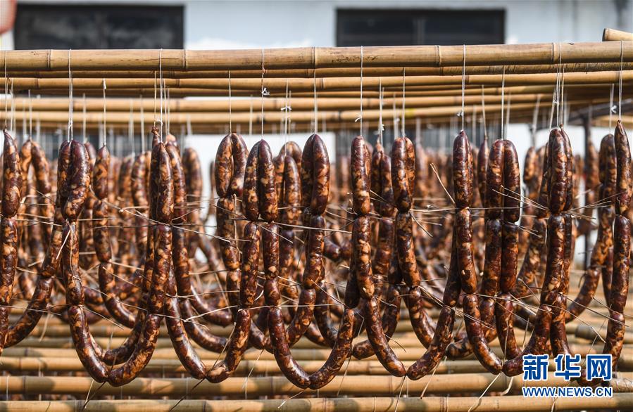 12月3日,安昌古镇一家名为阿红香肠的传统腊味作坊里晾晒了各种手工制作的绍兴腊味。新华社记者 徐昱 摄