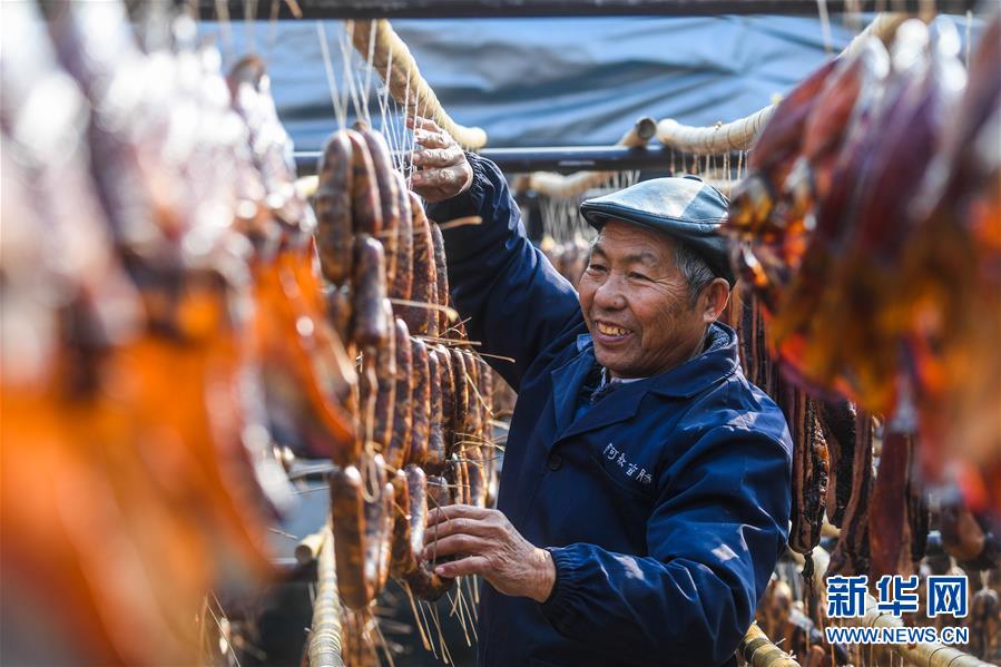 12月3日,安昌古镇一家名为阿红香肠的传统腊味作坊里的工作人员在晾晒各种手工制作的绍兴腊味。新华社记者 徐昱 摄