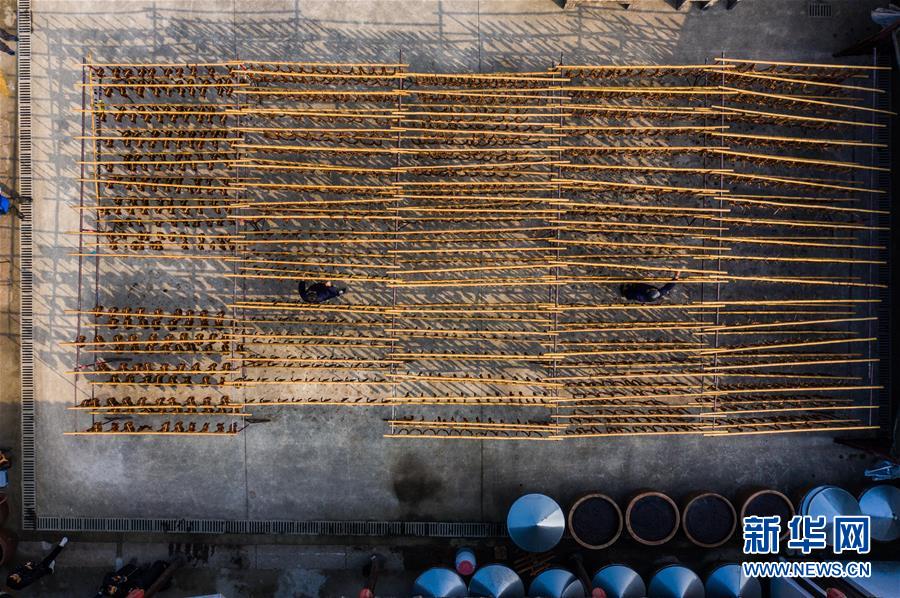 12月3日,安昌古镇传统腊味作坊里晒满了各种手工制作的绍兴腊味(无人机拍摄)。新华社记者 徐昱 摄
