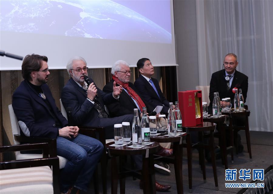 12月4日,在法国巴黎,法国品酒师协会主席菲利普·佛奥巴克(左二)在中法酒文化交流论坛上发言。新华社记者 高静 摄