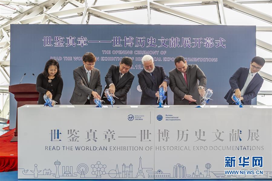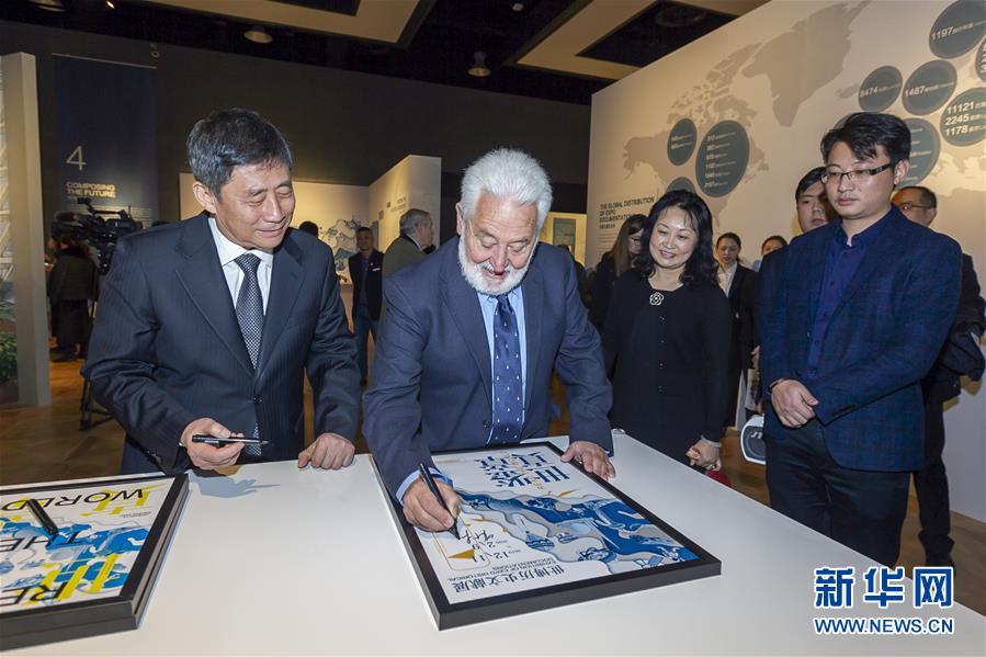 12月11日,国际展览局秘书长洛塞泰斯(中)在展览现场签名留念。新华社发(王翔摄)