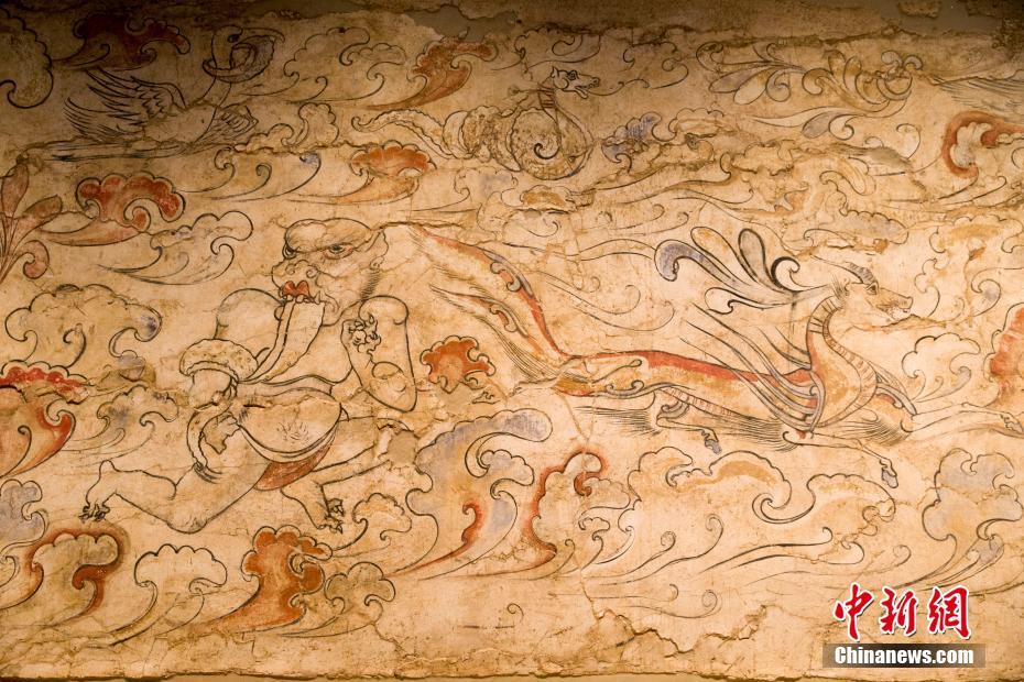 12月12日,在山西博物院开展的“壁上乾坤——山西北朝墓葬壁画艺术展”系统地再现了一个1500年前的地下世界。此次展览选取娄睿墓、九原岗墓、水泉梁墓的壁画精品,是山西博物院院藏北朝壁画的首次大规模集中亮相,呈现了北朝高超的绘画艺术和真实的社会面貌。图为《山海经》神兽图壁画。中新社记者 张云 摄