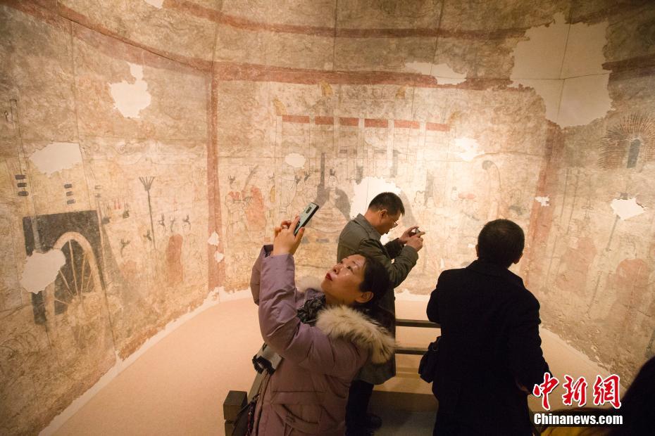 12月12日,山西太原,参观者正在拍摄壁画。当日,“壁上乾坤——山西北朝墓葬壁画艺术展”在山西博物院开展,系统地再现了一个1500年前的地下世界。此次展览选取娄睿墓、九原岗墓、水泉梁墓的壁画精品,是山西博物院院藏北朝壁画的首次大规模集中亮相,呈现了北朝高超的绘画艺术和真实的社会面貌。 中新社记者 张云 摄