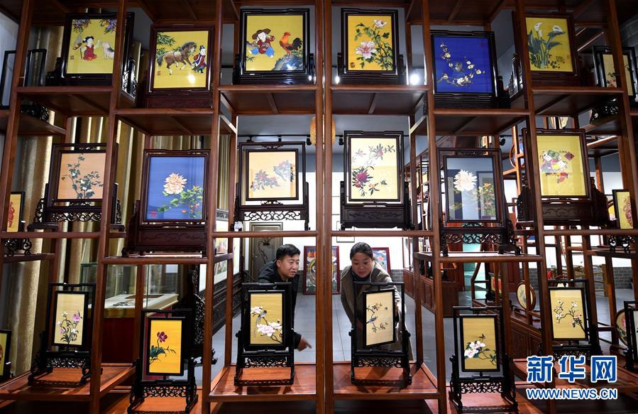12月14日,在河北定州缂丝传习基地,工作人员(右)在给游客介绍缂丝作品。 定州缂丝是一种以蚕丝为原料,采用“通经断纬”技法织成的双面平纹织物,工艺繁杂,经得起摸、擦、揉、搓、洗,有着“千年不坏的艺术织品”之誉,2013年被列入河北省第五批非物质文化遗产名录。近年来,河北定州积极推介缂丝,促进缂丝产业发展。 新华社记者 王晓 摄