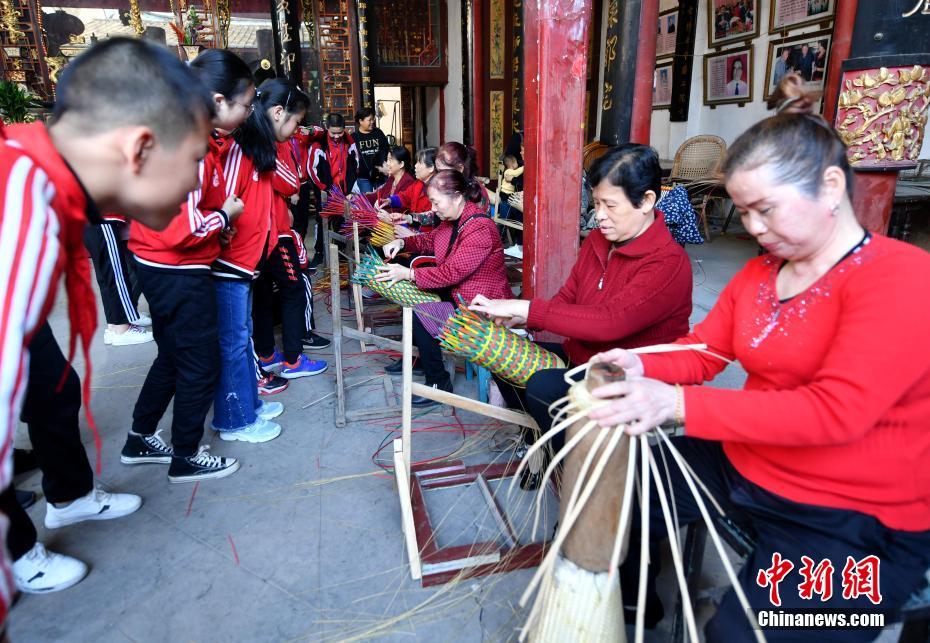 12月17日,小学生在参观竹编制作。福州市仓山区盖山镇郭宅村竹编历史最早可追溯到唐末宋初,所产竹编制品既有实用的农具、日用品,也有装饰用的工艺品,而被誉为“八闽竹器第一乡”。 中新社记者 吕明 摄