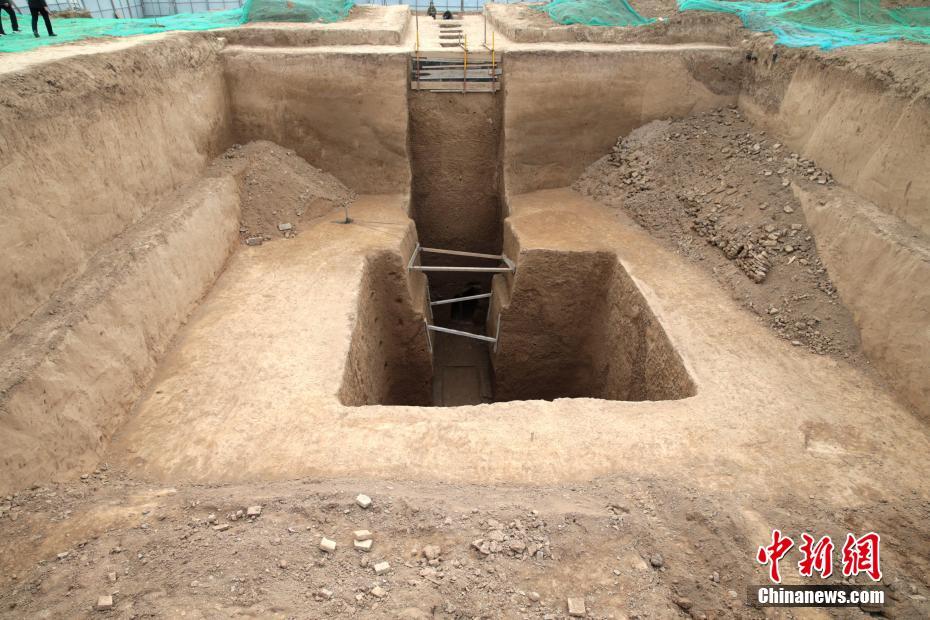 12月17日,陕西省考古研究院公布最新发掘成果,陕西省考古研究院在陕西西咸新区空港新城底张街道岩村发掘了一座带有四个天井和前后砖券墓室的大型唐代墓葬,出土墓志证实,该墓墓主是唐太平公主第一任驸马薛绍,下葬于神龙二年(706年)正月。墓内共出土各类文物120余件(组),主要为彩绘陶俑。据考古人员介绍,墓里的封门、甬道、墓室、棺椁等都遭到了大规模人为破坏,破坏墓葬的人并非以盗墓为目的。图为薛绍墓全景。 中新社记者 张远 摄