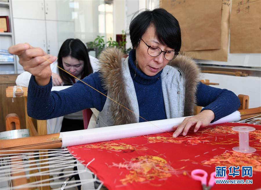 于静(前)与技师卫秒在进行京绣中的施绣工序(12月11日摄)。新华社发(任超摄)