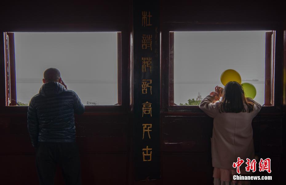 活动参与者在岳阳楼上眺望中国第二大淡水湖——洞庭湖。中新社记者 侯宇 摄