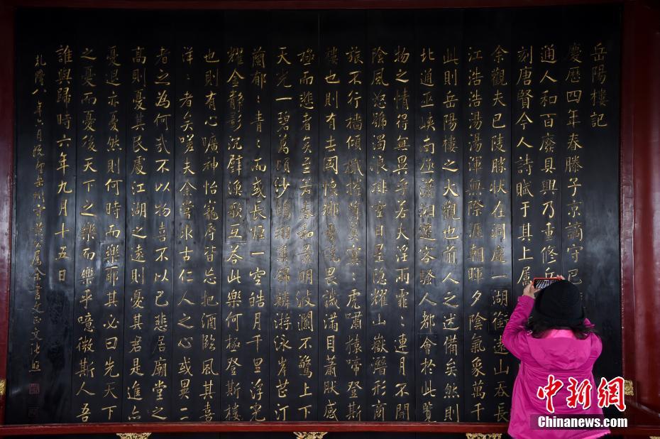 一名活动参与者在洞庭湖边著名的岳阳楼上观看“镇楼之宝”——《岳阳楼记》。中新社记者 侯宇 摄