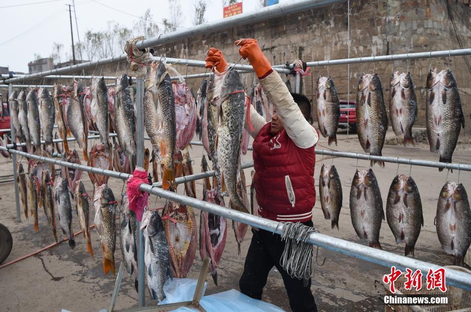 中国第二大淡水湖——洞庭湖湖畔的一名鱼贩正在晾晒湖鱼、制作鱼干,以备即将到来的春节期间的销售。中新社记者 侯宇 摄