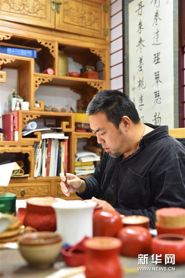 12月16日,马宁在工作室雕刻作品。雕漆工艺,是把天然漆料在胎体上涂抹出一定厚度,再用刻刀在堆起的平面漆胎上雕刻花纹的技法,包含髹漆、雕刻、磨光等工序。作为“燕京八绝”之一的北京雕漆在2006年被列入国家级非物质文化遗产名录。 马宁是北京雕漆的代表性传承人,他在北京市西城区非物质文化遗产保护中心拥有一间自己的工作室,同时在顺义区经营着一家雕漆工艺品工厂。创作之余,马宁还走进高校授课,将雕漆文化传播给更多人。新华社发(陈钟昊 摄)