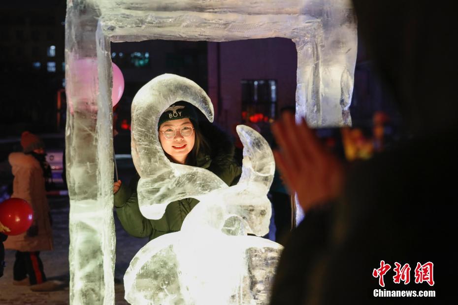 12月19日晚,哈尔滨工业大学第三届冰雪文化节开幕。本次冰雪文化节以“冰情雪韵哈工大 共筑华章迎百年”为主题,展现了独具特色的冰雪校园,让师生在家门口就能体验冰雪文化之美、感受冰雪运动的魅力。图为游客在冰雕展区拍照。 中新社记者 吕品 摄