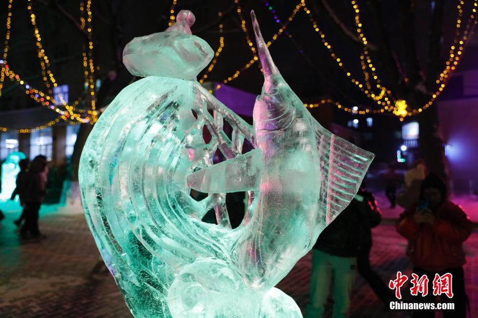12月19日晚,哈尔滨工业大学第三届冰雪文化节开幕。本次冰雪文化节以“冰情雪韵哈工大 共筑华章迎百年”为主题,展现了独具特色的冰雪校园,让师生在家门口就能体验冰雪文化之美、感受冰雪运动的魅力。图为学生的冰雕作品。 中新社记者 吕品 摄