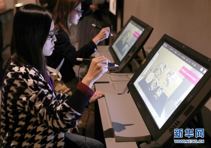 12月19日,工作人员在展览现场演示可供观众操作的青花瓷修复的电脑模拟技术。新华社记者 吴晓初 摄