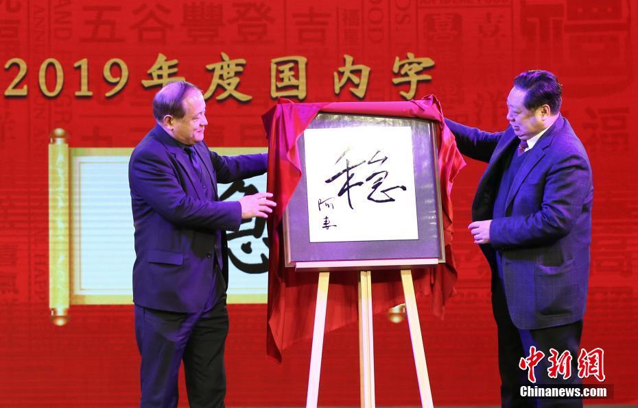 12月20日,由中国国家语言资源监测与研究中心、商务印书馆等主办的“汉语盘点2019”在北京揭晓。“稳”“我和我的祖国”“难”“贸易摩擦”分别当选年度国内字、国内词、国际字、国际词。图为嘉宾揭晓2019年度国内字“稳”。 中新社记者 卞正锋 摄