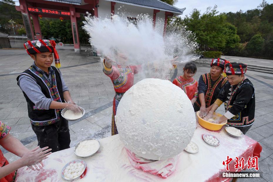 12月20日,畲族民众正在制作“冬节丸”。当日,湖南汝城九龙江的畲族青年男女们制作了一个直径1米的“冬节丸”,以此迎接冬至。 中新社记者 杨华峰 摄