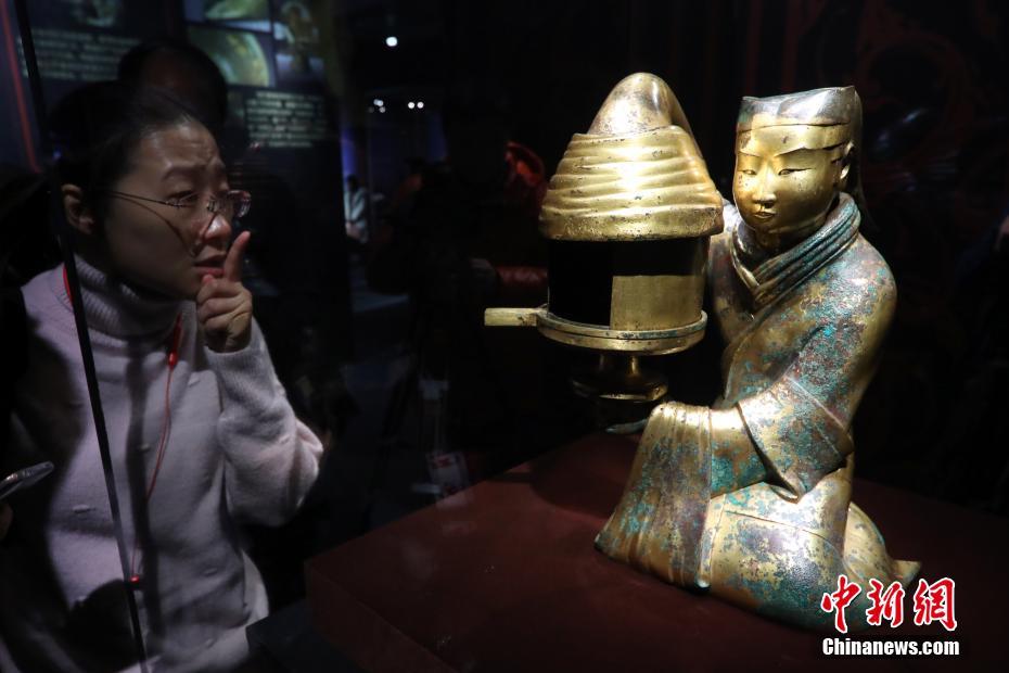 12月20日,展出的长信宫灯(中山王后窦绾墓出土)吸引观众的目光。当日,“兄弟王——从满城汉墓到大云山汉墓”汉代文物展在南京博物院正式开展。展览以西汉满城中山王陵、大云山江都王陵的出土文物为中心,展现西汉景帝至武帝时期诸侯王的文化、生活状态以及江都王刘非、中山王刘胜两人的兄弟、宗亲等关系。展览分为“诸侯王权”“王室仪轨”“事死如生”“永生之梦”四个部分,呈现汉文明中的先进文化。 中新社记者 泱波 摄