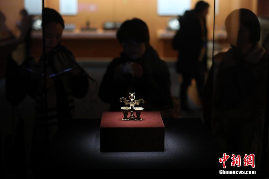 12月20日,展出的朱雀衔环杯(中山王后窦绾墓出土)吸引观众的目光。当日,“兄弟王——从满城汉墓到大云山汉墓”汉代文物展在南京博物院正式开展。展览以西汉满城中山王陵、大云山江都王陵的出土文物为中心,展现西汉景帝至武帝时期诸侯王的文化、生活状态以及江都王刘非、中山王刘胜两人的兄弟、宗亲等关系。展览分为“诸侯王权”“王室仪轨”“事死如生”“永生之梦”四个部分,呈现汉文明中的先进文化。 中新社记者 泱波 摄