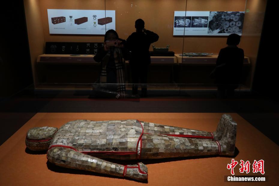 12月20日,展出的金缕玉衣(江都国王后墓出土)吸引观众的目光。当日,“兄弟王——从满城汉墓到大云山汉墓”汉代文物展在南京博物院正式开展。展览以西汉满城中山王陵、大云山江都王陵的出土文物为中心,展现西汉景帝至武帝时期诸侯王的文化、生活状态以及江都王刘非、中山王刘胜两人的兄弟、宗亲等关系。展览分为“诸侯王权”“王室仪轨”“事死如生”“永生之梦”四个部分,呈现汉文明中的先进文化。 中新社记者 泱波 摄