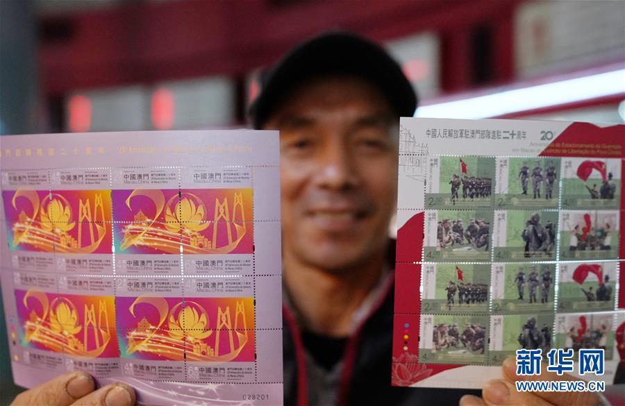 12月20日,在澳门邮政大楼,首批买到纪念邮票的人展示邮票。新华社记者 王申 摄