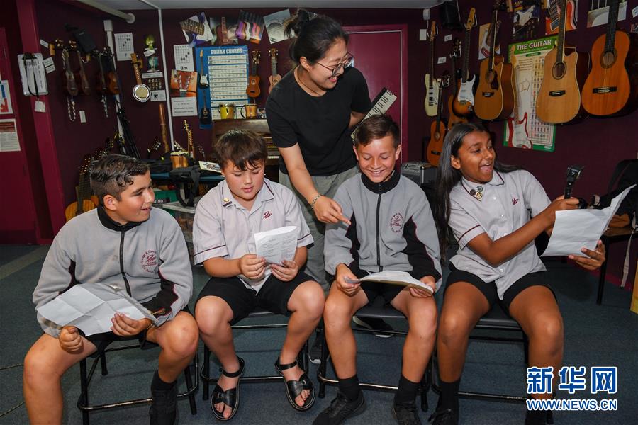 11月28日,在新西兰罗托鲁阿初级中学,中文助教乔巾哲(中)在音乐教室指导学生练习中文歌曲“Kia Ora,都来吧”。乔巾哲来自厦门大学,今年年初作为中文教学志愿者来到罗托鲁阿初级中学。在这个毛利文化氛围浓厚的地方,Kia Ora是乔巾哲学会的第一句毛利语。这是个“万能词”,可以表达“你好”“欢呼”“祝好运”“最好的祝愿”等很多意思。用“Kia Ora,都来吧”作首歌,是乔巾哲想出的动员新西兰孩子学中文的主意。对于当地孩子,乔巾哲就是他们了解中国的一扇窗。新华社记者 郭磊 摄