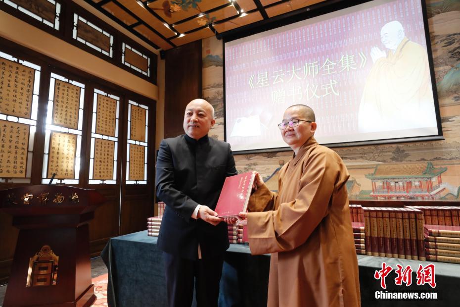 12月21日,《星云大师全集》简体中文版赠书仪式在北京故宫博物院建福宫花园敬胜斋举行。故宫博物院王旭东(左)院长出席赠书仪式,代表故宫博物院接受赠书。佛光山宗委、佛陀纪念馆馆长、星云文化教育公益基金会理事如常法师代表佛光山文教基金会进行赠书。《星云大师全集》简体中文版约4千万字,包括:经义、论丛、教科书、演讲集、文丛、传记、书信、日记、佛光山、年谱、影谱、附录等十二大类。中新社记者 杜洋 摄