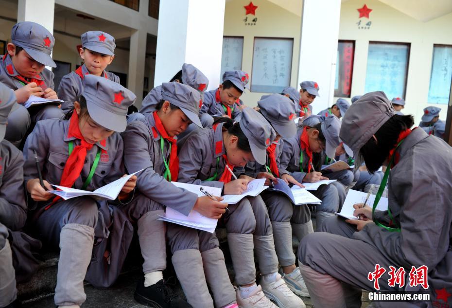 穿着红军服前来古田红军小镇参加研学活动的小学生正在写下所见所闻。张斌 摄