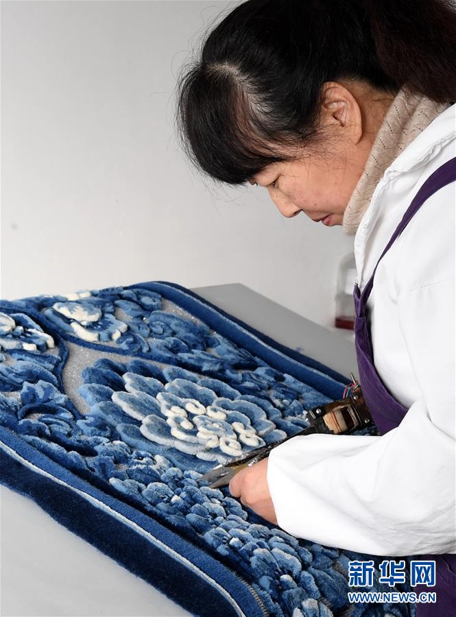 宫毯技师吴建美在薛氏宫毯工作室中进行宫毯的片剪作业(12月12日摄)。新华社发(任超 摄)