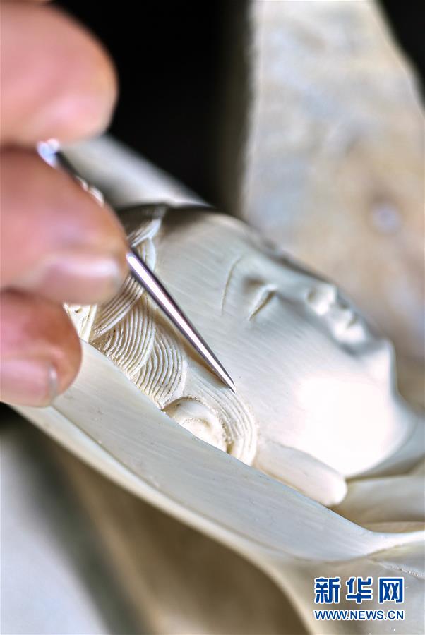国家非物质文化遗产项目牙雕代表性传承人、中国工艺美术大师李春珂在创作猛犸牙雕刻(12月25日摄)。新华社发(彭子洋 摄)
