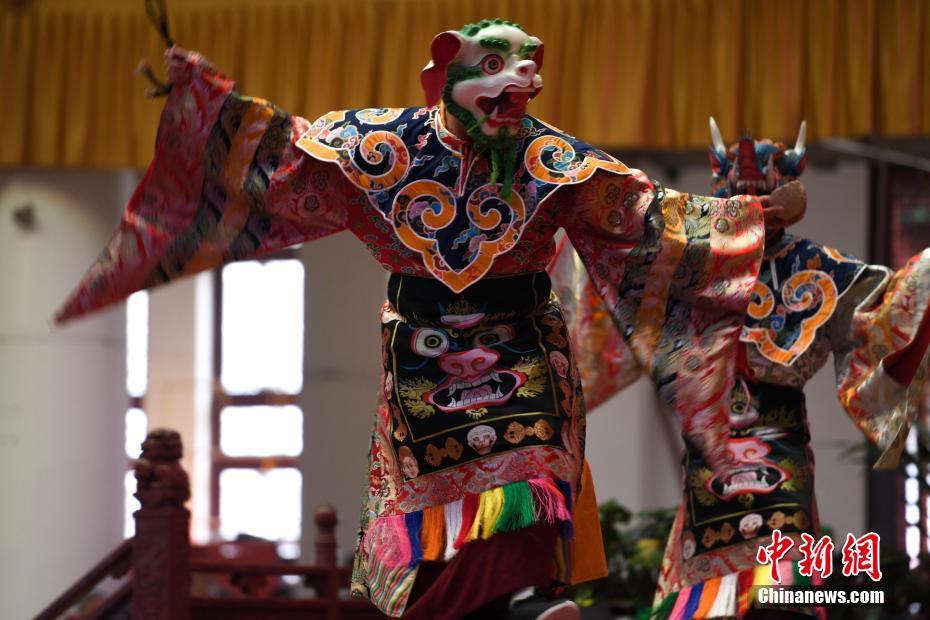 1月2日,僧人在舞台上表演“金刚舞”。当日,昆明宝华寺在中国传统腊八节邀请云南佛学院藏传佛教僧人跳“金刚舞”为新年祈福。中新社记者 康平 摄