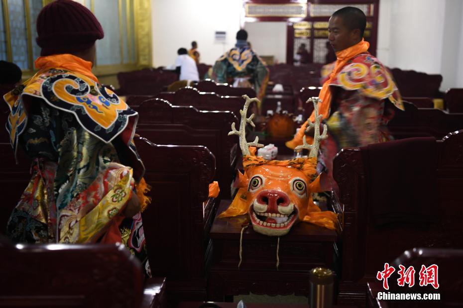 1月2日,僧人在“金刚舞”间隙进行短暂休息。当日,昆明宝华寺在中国传统腊八节邀请云南佛学院藏传佛教僧人跳“金刚舞”为新年祈福。中新社记者 康平 摄