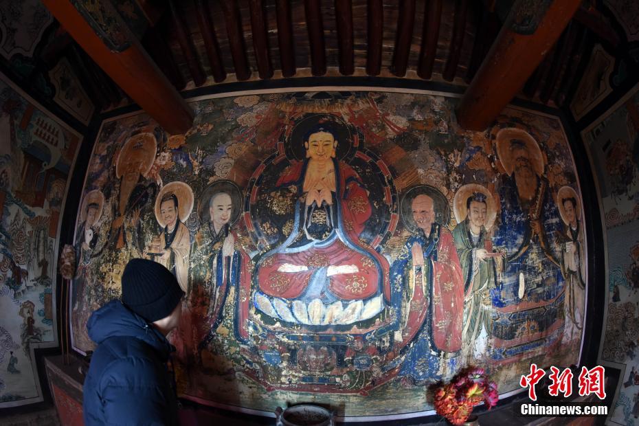 1月2日,游客在重泰寺三教楼内欣赏精美壁画。重泰寺位于河北蔚县城西北部涌泉庄乡,是蔚县规模最大、主体建筑保存最为完整的一处千年古刹,是全国重点文物保护单位。中新社记者 孙自法 摄