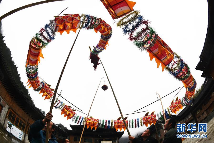 1月4日,广西龙胜各族自治县乐江镇宝赠村的村民们在练习吊龙舞。 春节临近,广西龙胜各族自治县乐江镇宝赠村的村民加紧制作吊龙,准备在春节前后表演吊龙舞。 新华社发(吴生斌 摄)