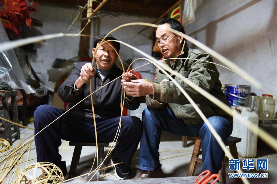 1月4日,广西龙胜各族自治县乐江镇宝赠村的村民吴必勋(右)与老艺人探讨吊龙的制作工艺。 春节临近,广西龙胜各族自治县乐江镇宝赠村的村民加紧制作吊龙,准备在春节前后表演吊龙舞。 新华社发(吴生斌 摄)