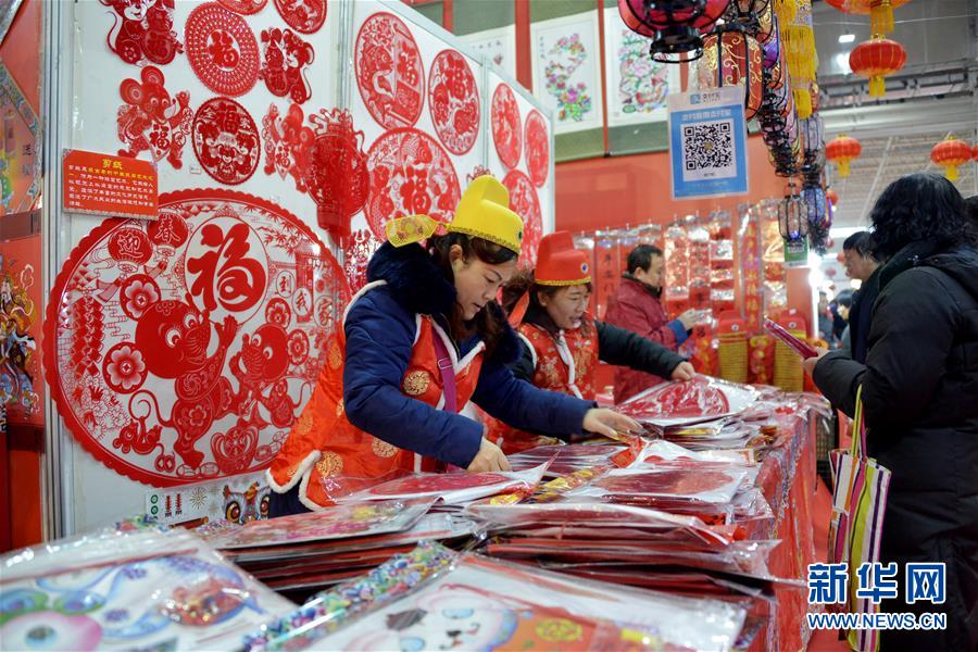 1月8日,商贩在内蒙古国际会展中心售卖窗花等年货。 当日,第六届呼和浩特年货博览会在内蒙古国际会展中心开幕。此次年货博览会为期13天,共有800余家国内外企业参展。 新华社记者 王靖 摄