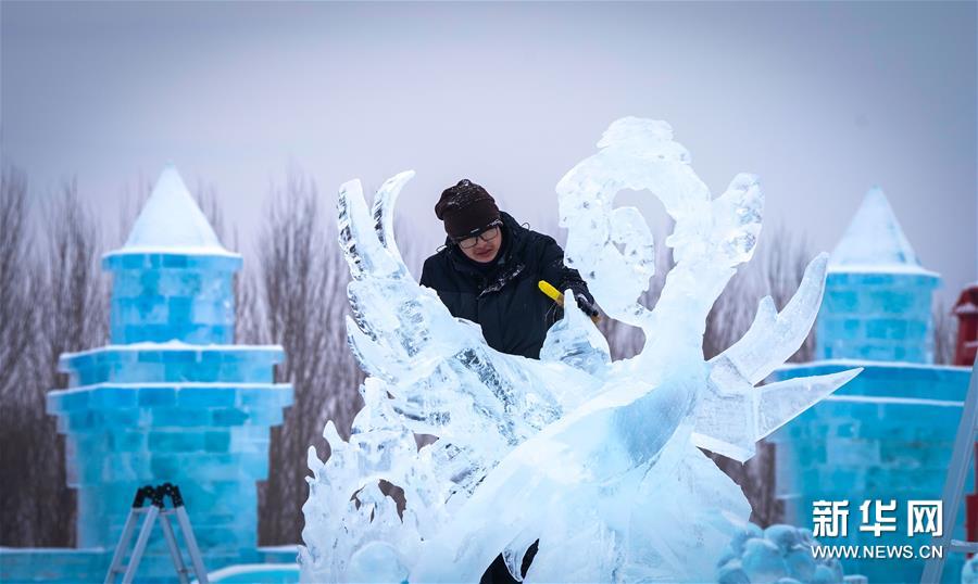 1月8日,中国哈尔滨东屹冰雪队的参赛队员在创作冰雕《女娲补天》。该作品最终获三等奖。新华社记者 王松 摄