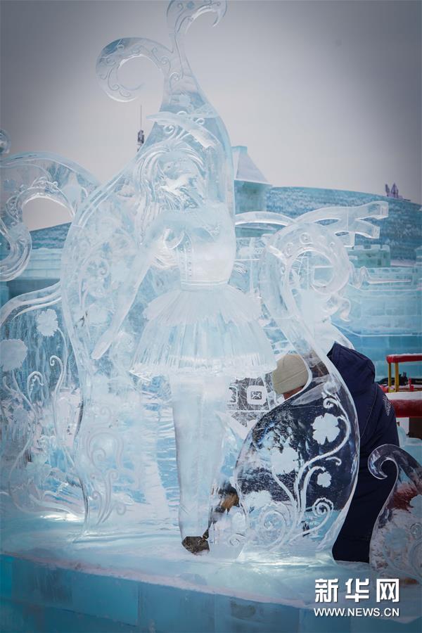 1月8日,俄罗斯哈巴罗夫斯克一队的参赛队员在创作冰雕《首次公演》。该作品最终获三等奖。新华社记者 王松 摄