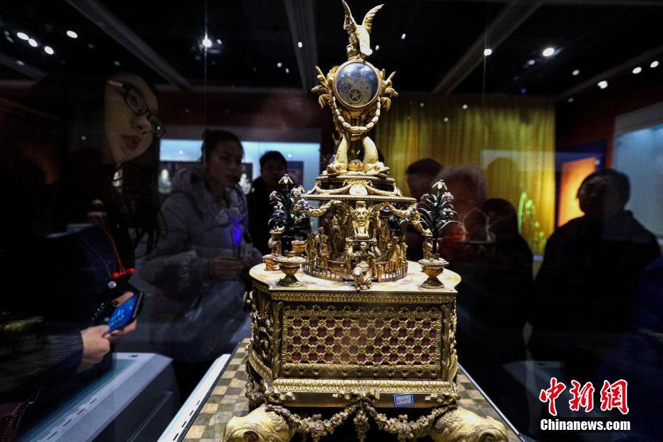 1月9日,《清高宗乾隆皇帝展》在郑州博物馆新馆持续展出。该展览设置两个展厅,分为“密诏即位,君临天下”“稽古崇文,靖边宣武”“怡情乐志,物阜工巧”“龙袍袈裟,兴黄安蒙”“观风问俗,出巡中州”五大单元,详实地回顾了乾隆皇帝登基以后的政治生涯和私人生活。本次“清高宗乾隆皇帝展”是郑州博物馆新馆试开放的第一展。图为铜镀金四象驮跑人转四角花日历表。 中新社记者 王中举 摄