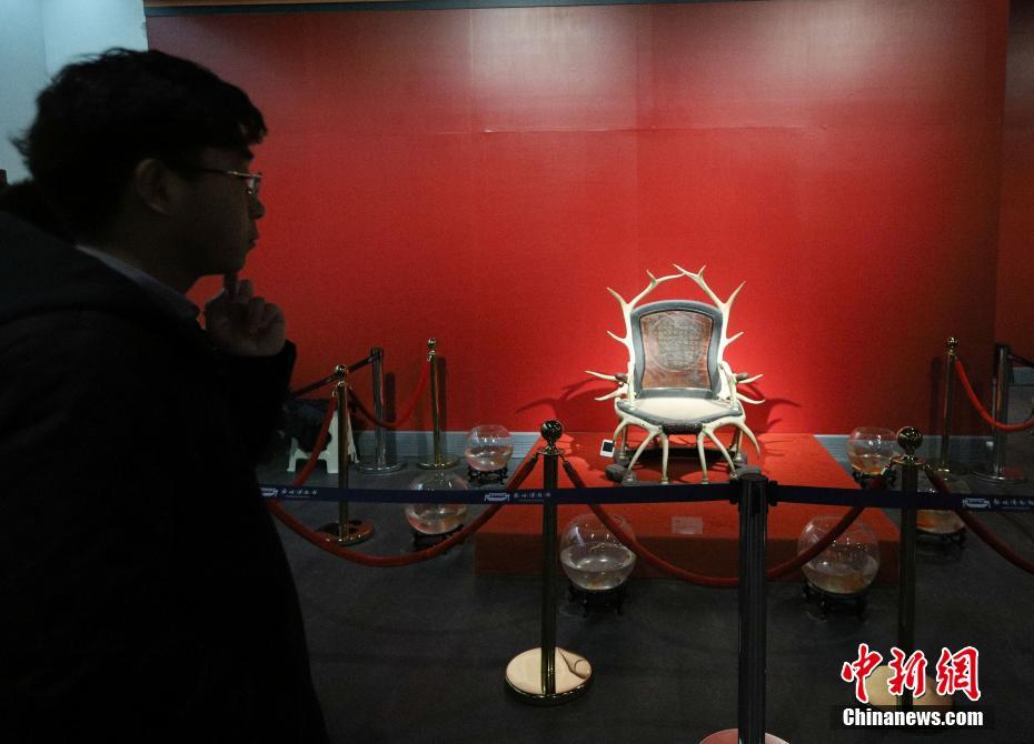 1月9日,《清高宗乾隆皇帝展》在郑州博物馆新馆持续展出。该展览设置两个展厅,分为“密诏即位,君临天下”“稽古崇文,靖边宣武”“怡情乐志,物阜工巧”“龙袍袈裟,兴黄安蒙”“观风问俗,出巡中州”五大单元,详实地回顾了乾隆皇帝登基以后的政治生涯和私人生活。本次“清高宗乾隆皇帝展”是郑州博物馆新馆试开放的第一展。图为用鹿角做成的罕见鹿角椅。 中新社记者 王中举 摄