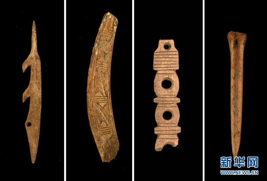 这张拼版照片显示的是黑龙江齐齐哈尔市洪河遗址出土的骨器(资料照片)。新华社发