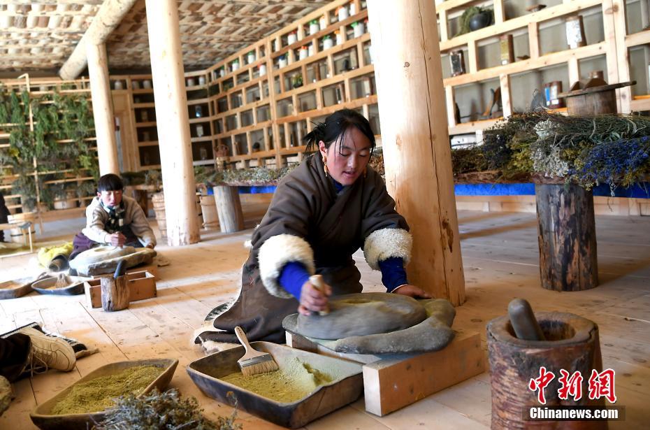 1月11日,记者走进四川阿坝州壤塘县一家仍保留纯手工生产工序的藏香制作传习所,探访传统藏香制作技艺。图为研磨制香原料。中新社记者 安源 摄
