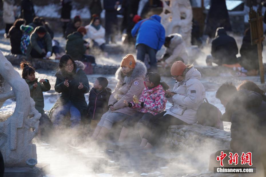 1月12日,游客在古北水镇体验温泉泡脚。北京司马台长城脚下的古北水镇景区在1月2日至2月8日期间举行“长城庙会过大年”活动。游客可体验庙会市集、民间花会、庙会小吃、街头民艺、冰上运动、露天温泉、夜赏花灯等活动。中新社记者 苏丹 摄