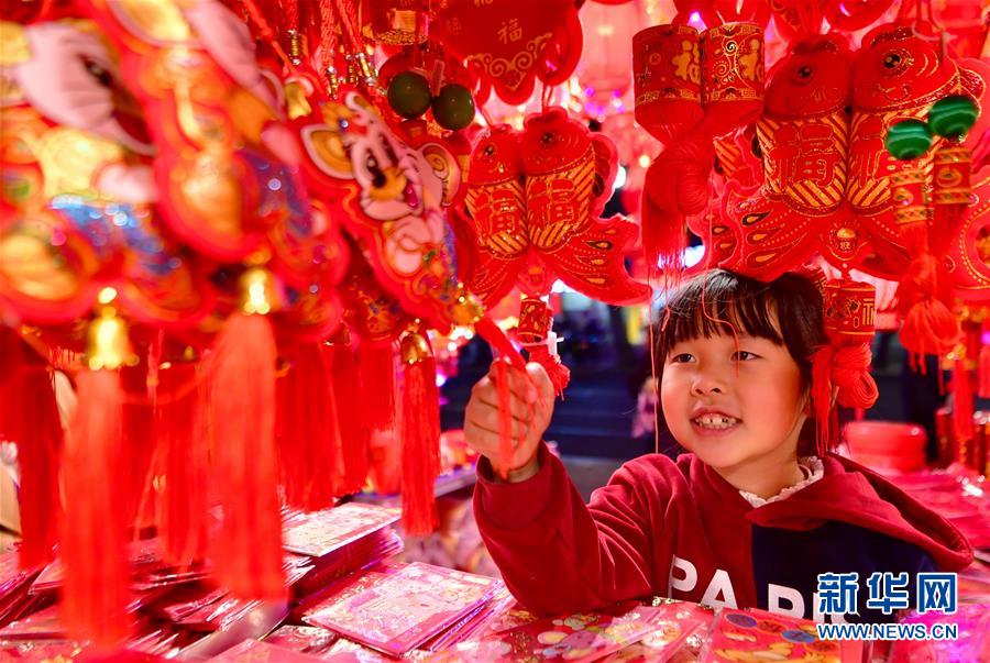 1月13日,一名小朋友在挑选挂饰。 春节临近,不少市民来到福州市鼓西路“春联一条街”选购春联、“福”字等节日饰品。 新华社记者 魏培全 摄