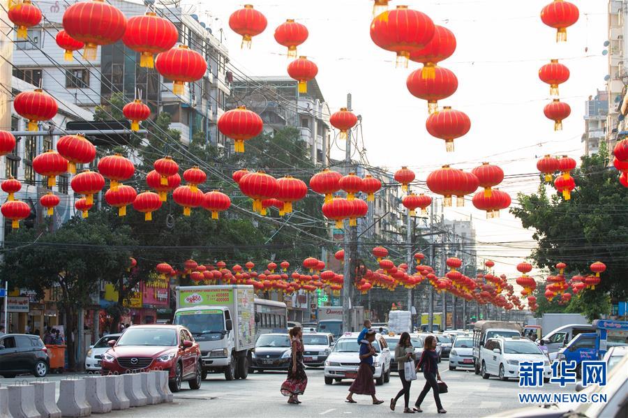 1月14日,红灯笼悬挂在缅甸仰光唐人街街头。